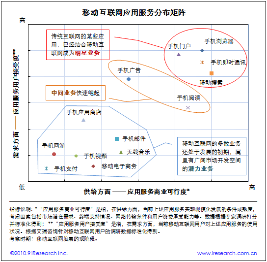 根據(jù)艾瑞咨詢近期發(fā)布的《2009-2010年中國移動互聯(lián)網(wǎng)行業(yè)發(fā)展報告》,移動互聯(lián)網(wǎng)各應(yīng)用服務(wù)在“應(yīng)用服務(wù)商業(yè)可行度”和“應(yīng)用服務(wù)用戶接受度”兩個維度上被劃分為“明星業(yè)務(wù)”、“中間業(yè)務(wù)”和“潛力業(yè)務(wù)”三個類型。具備一定規(guī)模化發(fā)展市場條件,但還面臨若干限制因素的移動互聯(lián)網(wǎng)業(yè)務(wù),將在未來逐步打開市場。