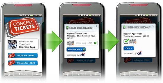 北京時間11月10日消息,據(jù)國外媒體報道,花旗銀行支持的Single-Click Checkout(singleclickcheckout.com)服務(wù)今天在舊金山的開放移動峰會(Open Mobile Summit)上推出,它是第一個為Android設(shè)計的信用卡結(jié)帳應(yīng)用程序。使用這項新服務(wù),商家可以接受來自任何移動用戶的信用卡付款。