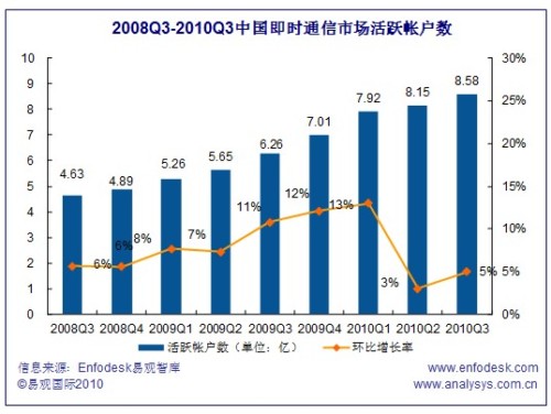 2010Q3中國(guó)即時(shí)通信市場(chǎng)活躍帳戶數(shù)超過8.58億