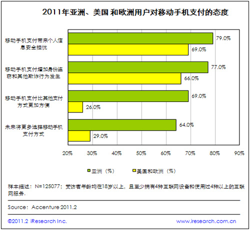 iResearch艾瑞咨詢根據(jù)Accenture的研究調(diào)查數(shù)據(jù)發(fā)現(xiàn),移動(dòng)手機(jī)支付安全問題受到全球用戶的普遍關(guān)心。根據(jù)2011年Accenture對(duì)亞洲、美國以及歐洲125077位手機(jī)用戶進(jìn)行的網(wǎng)上調(diào)查顯示,亞洲79%的受訪者擔(dān)心移動(dòng)手機(jī)支付帶來的個(gè)人信息安全隱患,77%的受訪者擔(dān)心身份盜竊和其他欺詐行為的發(fā)生;美國和歐洲擔(dān)心以上安全問題的用戶也分別占到69%和66%。