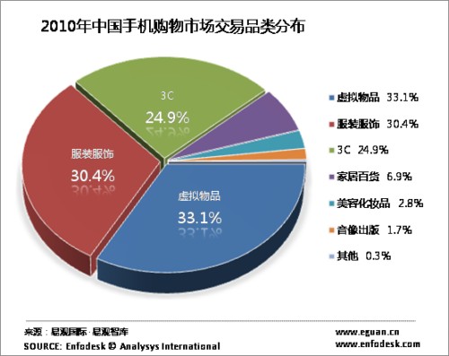 根據(jù)易觀智庫Enfodesk發(fā)布的《2010年第4季度中國手機購物市場季度監(jiān)測》數(shù)據(jù)顯示,2010年中國手機購物市場交易規(guī)模達到41億元。其中虛擬類商品交易規(guī)模達12億,占總體交易規(guī)模比例為33.1%。
