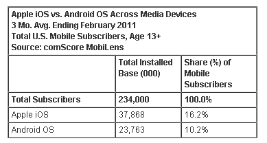 新的ComScore數(shù)據(jù)顯示,統(tǒng)計(jì)所有的移動(dòng)通信設(shè)備,包括手機(jī)、平板電腦、iPodTouch等,蘋果iOS平臺(tái)在美國遠(yuǎn)超Android59%。換句話說,蘋果16.2%的移動(dòng)設(shè)備市場份額超過了Android的10.2%。