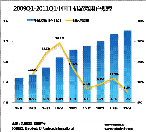 結(jié)合上圖所示,手機(jī)游戲用戶規(guī)模在經(jīng)歷了2009年爆炸性增長(zhǎng)和2010年理性回歸后,在 2011年第1季度進(jìn)入緩慢增長(zhǎng)期。