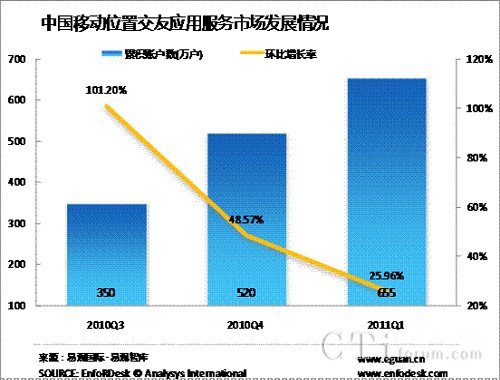 2011年Q1中國移動位置交友應(yīng)用累計帳戶數(shù)達(dá)655萬