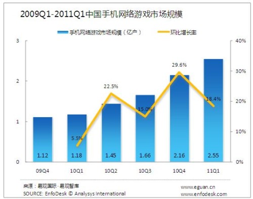2011年第1季度中國手機(jī)網(wǎng)絡(luò)游戲市場規(guī)模達(dá)2.55億