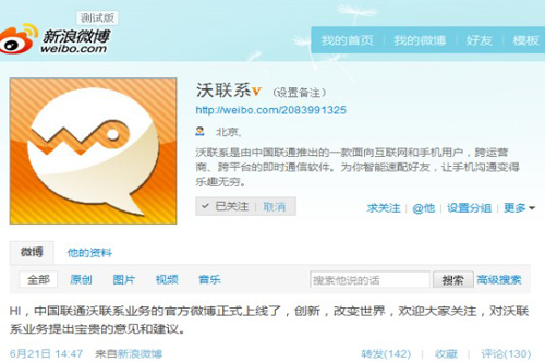 昨日下午,中國聯(lián)通“沃聯(lián)系”業(yè)務(wù)官方微博正式上線,而在稍后晚間,中國聯(lián)通官方微博也對此微博進(jìn)行推介,并稱“中國聯(lián)通即將推出一款面向互聯(lián)網(wǎng)和手機用戶,跨運營商、跨平臺的即時通信軟件‘沃聯(lián)系’。為幫助用戶朋友更好了解和使用這款即將上線的產(chǎn)品,中國聯(lián)通沃聯(lián)系產(chǎn)品組現(xiàn)已開通@沃聯(lián)系新浪官方微博,敬請關(guān)注。”
