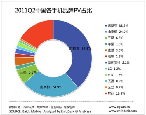2、諾基亞智能手機受Android系對手沖擊,份額下滑。2011年第二季度諾基亞手機PV份額占到39%,相比上季度的40.4%,環(huán)比下降3%。其原因主要是受到來自安卓系統(tǒng)智能手機品牌與山寨機雙向的擠壓。最主要的還是安卓系統(tǒng)這一開放系統(tǒng)聚集了大量的智能手機品牌,從而適用于安卓系統(tǒng)的應用迅速擴大規(guī)模,占領智能手機市場較大份額。