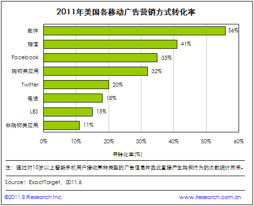iResearch艾瑞咨詢整理ExactTarget調(diào)研數(shù)據(jù)時(shí)發(fā)現(xiàn):2011年在驅(qū)動美國手機(jī)用戶產(chǎn)生購買的移動廣告營銷方式中,電子郵件營銷的轉(zhuǎn)化率最高,達(dá)到56%,短信、Facebook、購物類手機(jī)應(yīng)用(如Amazon、eBay、Groupon)以41%、35%、32%的轉(zhuǎn)化率依次位居二、三、四位。