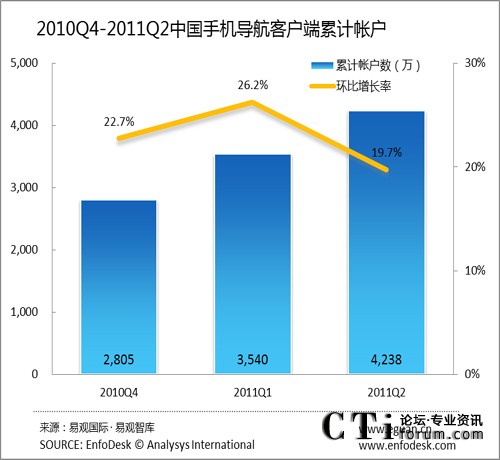 2011年Q2中國手機導航客戶端累計帳戶達4238萬