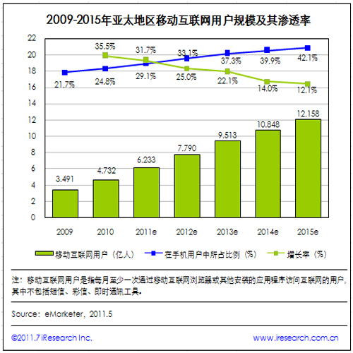 iResearch艾瑞咨詢整理eMarketer數(shù)據(jù)時發(fā)現(xiàn),2010年亞太地區(qū)移動互聯(lián)網(wǎng)用戶規(guī)模達到4.732億,較2009年增長35.5%,占手機用戶總數(shù)的24.8%。預(yù)計2011年移動互聯(lián)網(wǎng)用戶數(shù)將達6.233億,增幅為31.7%,占手機用戶總數(shù)的29.1%。在未來的5年里,亞太地區(qū)移動互聯(lián)網(wǎng)用戶規(guī)模增速有所下降,但其在手機用戶總數(shù)中的比例將進一步增加。