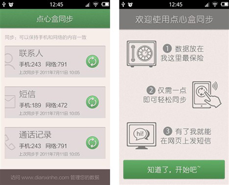 點(diǎn)心盒同步使用十分方便,在手機(jī)上安裝客戶端,通過注冊獲取賬號(hào),登陸后進(jìn)入軟件的主界面,僅需輕點(diǎn)同步按鈕,即可將聯(lián)系人、短信和通話記錄同步到點(diǎn)心盒網(wǎng)站上。此時(shí),不僅在手機(jī)端,用戶在云端通過點(diǎn)心盒網(wǎng)站也可以進(jìn)行聯(lián)系人新建、編輯和刪除的操作,并支持聯(lián)系人導(dǎo)入和去除重復(fù)的聯(lián)系人,方便聯(lián)系人管理。