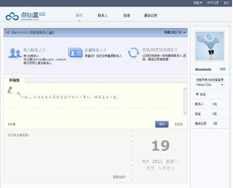 點(diǎn)心盒同步的另一特色功能就是云端收發(fā)短信和查看通話記錄。由于點(diǎn)心盒同步開啟自動(dòng)同步之后是即時(shí)同步的,即使忘記帶手機(jī)也沒有關(guān)系,可以通過登陸點(diǎn)心盒網(wǎng)站來查看短信和通話記錄,這樣就可以看到?jīng)]帶手機(jī)期間誰聯(lián)系過自己,可通過云端進(jìn)行短信收發(fā),而且可利用云端來快速大量發(fā)送短信。用戶只需一臺(tái)可以上網(wǎng)的電腦或Pad,登錄點(diǎn)心盒,就可以隨時(shí)隨地打開網(wǎng)頁瀏覽手機(jī)里的資料。
