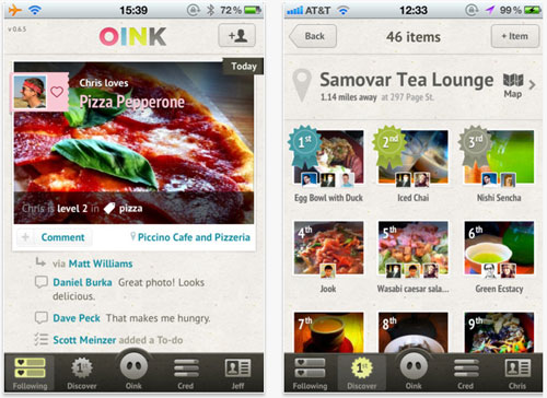 與Foursquare不同的是,Oink不是讓用戶為整個店評分,而是具體到店里的每一樣?xùn)|西。以比薩餅為例,附近有那些店提供,哪家的得分更高,哪位用戶在這方面的推薦更為可信,您都可以一目了然地查到。