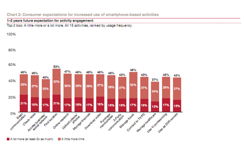 而在未來兩年,這些不同的功能使用只會越來越多,像基本的通信功能、LBS等,21%的用戶預(yù)計使用的程度將是今天的2倍以上