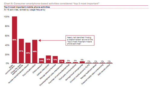 在用戶認(rèn)為最重要的移動活動中,尋找本地位置位于基本通信功能、新聞閱讀之后,而且超過56%的用戶每周至少會使用手機(jī)一次查找位置信息