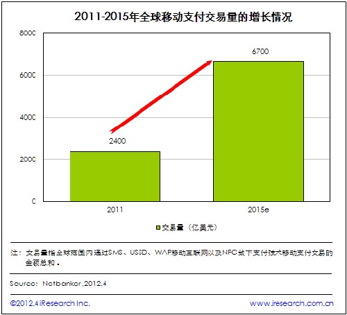 iResearch艾瑞咨詢整理Netbanker的最新數(shù)據(jù)發(fā)現(xiàn),2011年全球移動支付交易量達到2400億美元。該統(tǒng)計數(shù)據(jù)顯示,2015年全球移動支付交易量將達到6700億美元,使用手機銀行應(yīng)用程序的用戶數(shù)量較2010年將增加45%左右。另外,預(yù)計在未來18個月內(nèi)還會有20個國家增設(shè)NFC服務(wù)。