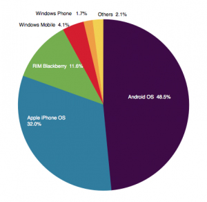 北京時(shí)間5月8日早間消息,市場(chǎng)調(diào)研公司尼爾森周一發(fā)布調(diào)查報(bào)告稱,美國市場(chǎng)智能機(jī)用戶量已經(jīng)超越基本功能手機(jī)用戶量。今年3月,智能機(jī)在美國手機(jī)市場(chǎng)的份額為50.4%,Android繼續(xù)占據(jù)統(tǒng)治地位,在智能機(jī)中的份額為48.5%。