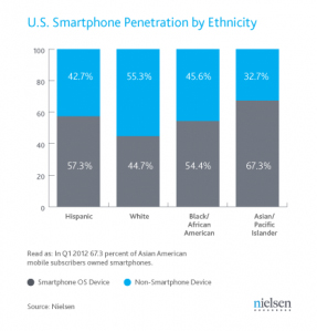 尼爾森還對(duì)具體使用智能機(jī)的美國人群進(jìn)行了分析。亞裔美國人使用智能機(jī)比率最高,67.3%的亞裔美國人將智能機(jī)作為其主要手機(jī)設(shè)備;西班牙裔排在第二,比率為57.3%;非洲裔排在第三,比率為54.4%;美國白人最低,為44.7%。