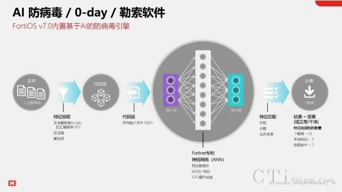 目前,AI技術(shù)已深度融入Fortinet的數(shù)十種產(chǎn)品與方案中。在最新版的統(tǒng)一網(wǎng)絡(luò)安全操作系統(tǒng)FortiOS 7.6中,就已經(jīng)內(nèi)置了由FortiGuard AI實(shí)驗(yàn)室研發(fā)的基于AI的防病毒引擎。該引擎運(yùn)用神經(jīng)網(wǎng)絡(luò)技術(shù),學(xué)習(xí)并區(qū)分海量病毒文件與正常文件,通過(guò)分類(lèi)打分的方式,實(shí)現(xiàn)對(duì)未知文件與病毒的精準(zhǔn)判斷,無(wú)需依賴(lài)傳統(tǒng)的病毒特征庫(kù)。因此,F(xiàn)ortinet的FortiGate等產(chǎn)品在防病毒方面擁有雙引擎加持,既有傳統(tǒng)的基于病毒特征庫(kù)的防病毒引擎,又有基于AI的下一代防病毒引擎(Anti-virus NGAV),雙重保障,安全無(wú)憂。