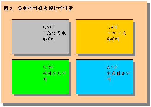 。。為了對此進(jìn)行說明,假設(shè)呼叫中心每天可預(yù)計(jì)處理大約20000個呼叫。這包含了上文所述的四種呼叫。將有50%以上呼叫中心接到的呼叫是關(guān)于基本服務(wù)請求或性質(zhì)請求。這種預(yù)計(jì)呼叫量不包括預(yù)計(jì)呼叫增長量,因?yàn)闆]有以往信息不能估計(jì)出增長情況。而在呼叫中心運(yùn)行初期通常是沒有這些信息的。應(yīng)在執(zhí)行計(jì)劃中進(jìn)行增長假設(shè)分析,保證系統(tǒng)容量在執(zhí)行服務(wù)市場計(jì)劃后可以應(yīng)付相應(yīng)的增長水平。