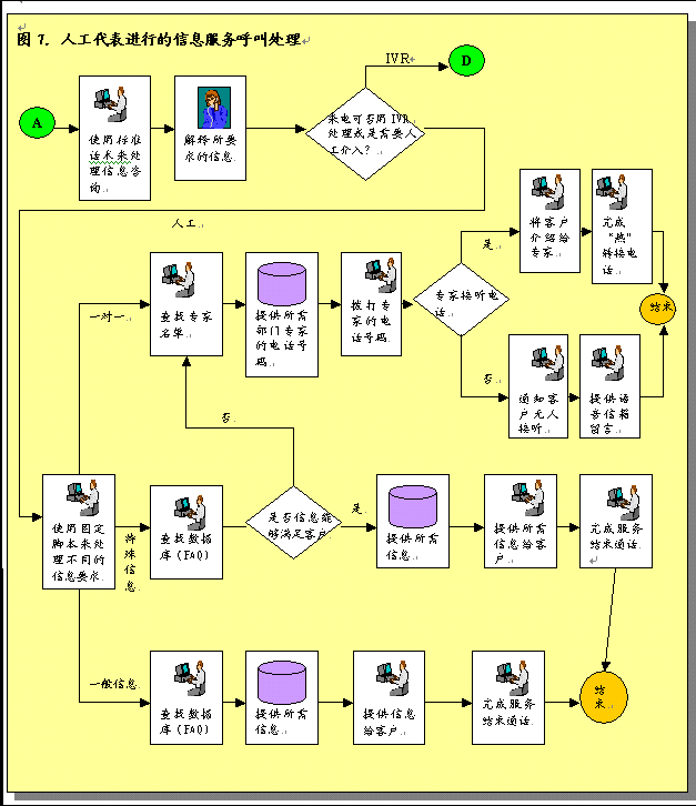 各部門也需要修改步驟處理和完成服務(wù)請求。現(xiàn)在,大多數(shù)公司個(gè)別部門接受和完成服務(wù)請求。許多部門在完成工作之后沒有對結(jié)果進(jìn)行跟蹤回訪。對于一些部門服務(wù)請求只是紙上談兵。為了有效的提供呼叫中心服務(wù)并為服務(wù)請求提供信息,各部門必須采用新的步驟。這些步驟應(yīng)包括從服務(wù)請求系統(tǒng)中重新獲取呼叫請求信息,跟蹤這些請求,工作完成后更新服務(wù)請求系統(tǒng)。對于沒有信息系統(tǒng)和目前使用人工操作的部門,要達(dá)到這一工作要求就需要設(shè)計(jì)和實(shí)施新的程序和系統(tǒng)。