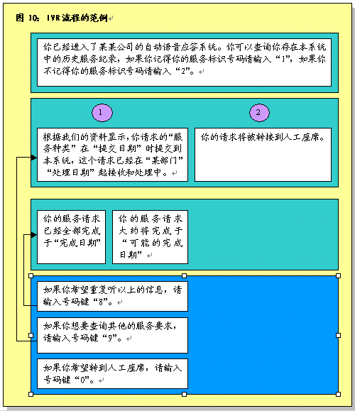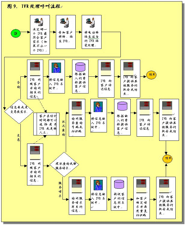 根據(jù)呼叫處理部分所作的說明,在完成初次聯(lián)絡(luò)過程之后,服務(wù)代表將確定呼叫者的需要。之后服務(wù)代表將協(xié)助呼叫者或者使其選擇IVR系統(tǒng),該系統(tǒng)通過自動(dòng)為這些請求錄音提供相關(guān)的信息和服務(wù)。服務(wù)代表將接受培訓(xùn)識別哪些交易服務(wù)和信息服務(wù)可以通過IVR進(jìn)行,這樣他們可以使呼叫者選擇自我服務(wù)。圖9圖示了用這一辦法處理呼叫的過程。