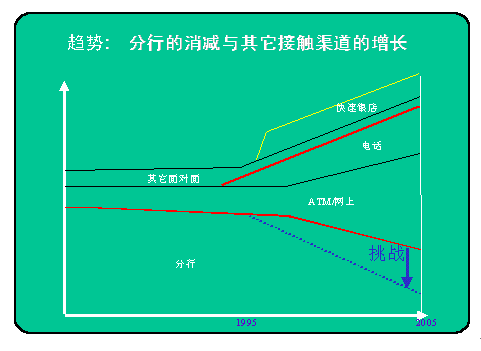 。。下圖為國外專家對銀行不同客戶服務(wù)渠道發(fā)展比例的說明。可以看到,營業(yè)廳的比例在逐年下降,而國外不少銀行甚至將進(jìn)一步壓縮營業(yè)廳比例作為一項渠道的任務(wù)。電話銀行也就是通過IVR實現(xiàn)的自助服務(wù),自然是呼叫中心的一部分,但人工服務(wù),包括對上網(wǎng)及其它互動方式的客戶提供的座席代表服務(wù),當(dāng)然更是現(xiàn)代呼叫中心業(yè)務(wù)的一部分,圖上雙紅線內(nèi)所表示的正是不斷發(fā)展的呼叫中心的所占比例。