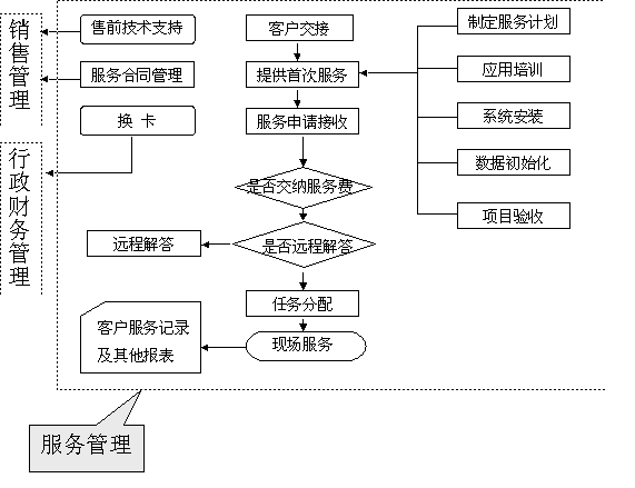 選定適合中小企業(yè)應(yīng)用的CRM軟件 ----啟利CRM ( ChineseCRM.Net ),并由啟利公司負(fù)責(zé)提供實(shí)施服務(wù)。CRM系統(tǒng)的主要模塊包括:市場管理、銷售管理、服務(wù)管理、行政管理,各模塊主要業(yè)務(wù)流程圖如下: