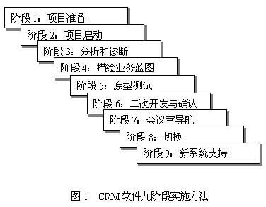 在此,結合項目管理和管理信息系統(tǒng)實施的特點,本文給出CRM軟件系統(tǒng)九階段的實施方法。如圖所示