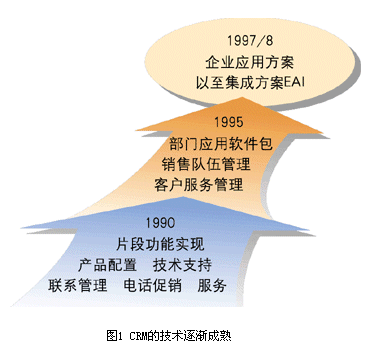 ----二是CRM的技術(shù)逐漸走向成熟(見圖1)。1990年左右,CRM方案只是片斷功能的實(shí)現(xiàn),到1995年以來、1997/8年以來,逐漸出現(xiàn)了部門級(jí)應(yīng)用軟件包、企業(yè)級(jí)應(yīng)用方案。有些企業(yè)甚至已經(jīng)開始關(guān)心自己原有的ERP系統(tǒng)與正在建設(shè)的CRM系統(tǒng)之間的集成問題。