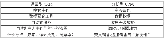 一般情況下CRM的可分為兩大類(lèi):即運(yùn)營(yíng)型CRM和分析型CRM。(有時(shí)把"協(xié)作型CRM"單獨(dú)作為一類(lèi))。多數(shù)情況之下運(yùn)營(yíng)型CRM引用的是產(chǎn)品,服務(wù)和一個(gè)企業(yè)實(shí)際能夠"照料"客戶(hù)的運(yùn)做能力。關(guān)系中心,數(shù)據(jù)集合系統(tǒng)及Web站點(diǎn)僅僅是一些例子。分析型CRM主要指用來(lái)推動(dòng)"以客戶(hù)為中心"的戰(zhàn)略和工具。商務(wù)智能系統(tǒng),數(shù)據(jù)挖掘工具及客戶(hù)層級(jí)戰(zhàn)略都可以算在這個(gè)范疇之內(nèi)。