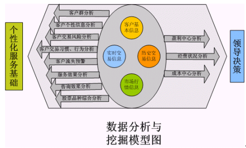 。。從上圖可以看出,在這個客戶信息數(shù)據(jù)分析模塊當(dāng)中,主要分析對象是客戶的基本信息、客戶的實(shí)時交易信息、客戶的歷史交易信息、客戶帳戶信息和市場行情信息等幾個處于孤島形狀的信息模塊。而得到的分析結(jié)果應(yīng)該包括如下幾個基本方面,以被為領(lǐng)導(dǎo)的決策和企業(yè)的業(yè)務(wù)流程服務(wù):