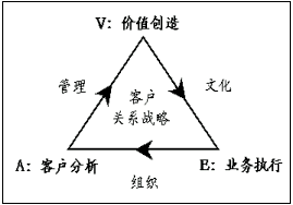 在全球CRM最佳實踐中有一種被稱作CRM"魔三角"的原理,備受企業(yè)的青睞。如下圖所示,構成三角形三個頂點的,分別是"A"客戶分析、"V"價值創(chuàng)造和"E"業(yè)務執(zhí)行,它們反映客戶關系管理的全部內(nèi)容;構成三角形三條邊的分別是"AV"管理、"VE"文化和"EA"組織,它們代表與客戶關系管理內(nèi)容相適應的運營環(huán)境及其方法。