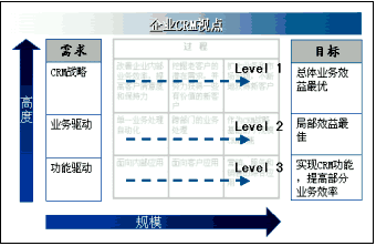 從全球CRM最佳實踐來看,企業(yè)實施CRM不外乎CRM軟件功能驅(qū)動、業(yè)務(wù)驅(qū)動和客戶關(guān)系戰(zhàn)略驅(qū)動三種情況。所以,實施CRM的視點也有三種,如下圖所示:一是,從CRM產(chǎn)品功能角度,根據(jù)產(chǎn)品所能提供的功能,選擇自己需要實施的CRM內(nèi)容。這種視點充其量只能夠讓企業(yè)擁有部分CRM的功能,有限地提高部分業(yè)務(wù)處理的效率。二是,從業(yè)務(wù)角度出發(fā),通過局部優(yōu)化業(yè)務(wù)流程,實施CRM。在項目中所涉及的業(yè)務(wù)流程可能要貫穿多個CRM功能模塊。這種視點解決了一部分業(yè)務(wù)問題,它主要以流程效益或部門效益最優(yōu)為目標。三是,從企業(yè)CRM戰(zhàn)略角度出發(fā),從總體、全局、發(fā)展的高度規(guī)劃和實施CRM。CRM戰(zhàn)略驅(qū)動視點不僅追求局部效益最優(yōu),而且能夠?qū)崿F(xiàn)企業(yè)總體業(yè)務(wù)效益的最大化。雖然,企業(yè)可以根據(jù)自身客戶關(guān)系管理的實際情況選擇CRM視點的高度,但是在絕大多數(shù)企業(yè)的實踐中,都會選擇CRM戰(zhàn)略高度作為著眼點,規(guī)劃企業(yè)客戶關(guān)系管理。