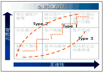 1是"小步快跑"型,Type 2是"改革優(yōu)先"型,Type 3是"技術(shù)驅(qū)動"型,如下圖所示。圖中互連性,表示企業(yè)信息化環(huán)境建設(shè)的規(guī)模,也意味著企業(yè)與客戶的交互程度,即溝通能力;縱坐標所示的智能化,代表管理思想、管理模式、知識應(yīng)用和情感投入,是客戶關(guān)系管理中人性化和價值衡量的雙重體現(xiàn)。