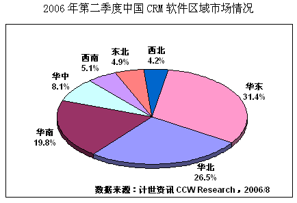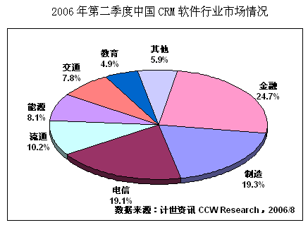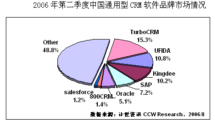 計(jì)世資訊(CCW Research)數(shù)據(jù)顯示,2006年二季度中國CRM軟件市場規(guī)模達(dá)2.25億元人民幣,比去年同期增長20.1%,其中通用型CRM軟件市場規(guī)模為0.80億元,占總體CRM市場份額的35.5%。