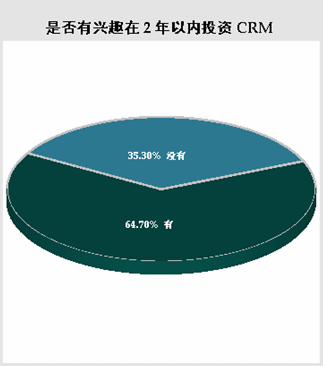 在選擇“尚未使用任一CRM軟件”的被調(diào)查者中,當(dāng)被問(wèn)及基于現(xiàn)在的狀況,“是否有興趣在兩年以內(nèi)投資CRM”。有64.70%的被調(diào)查者選擇有興趣在兩年內(nèi)投資CRM軟件,而選擇沒(méi)有興趣在兩年內(nèi)投資CRM軟件的只占35.30%。盡管現(xiàn)在實(shí)際使用CRM軟件的用戶所占比例還不甚理想,但市場(chǎng)前景還是非常看好,大部分公司具有實(shí)施CRM軟件的需求。