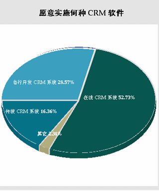 CRM軟件,或在線CRM軟件”;也有28.57%的被調(diào)查者選擇自行開(kāi)發(fā)CRM軟件;相比于前面兩種類型,被調(diào)查者對(duì)傳統(tǒng)CRM軟件的需求則處于一個(gè)較低的水平,有16.36%的被調(diào)查者仍然選擇有興趣在兩年投資傳統(tǒng)的CRM軟件。雖然ASP的模式在中國(guó)市場(chǎng)上的認(rèn)知度仍然有限,但是市場(chǎng)對(duì)on-demand