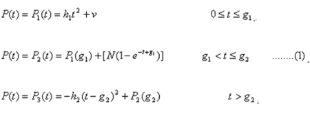 式中,P(t)為客戶第t個時間單元的客戶利潤。P1(t)為一二次增函數(shù),表示客戶利潤以一定的加速度(2h1)快速增加;P2(t)為一上漸近線函數(shù),表示客戶利潤一直增長但增長越來越慢,且始終越不過一個利潤最高限,最高限為(P1(g1)+N);P3(t)為一個二次降函數(shù),表示客戶利潤以一定的加速度(2h2)銳減。參數(shù)v、h1、h2、g1、g2、N都是正常數(shù)。v是客戶第一次購買帶給公司的利潤,通常這個值不高,甚至接近0(不考慮獲取成本,否則v常為負值)。h1、h2反映了客戶利潤增長和下降的加速度。g1、g2是利潤曲線發(fā)生轉折的兩個時點。N是g1時點后利潤總增幅的極限。