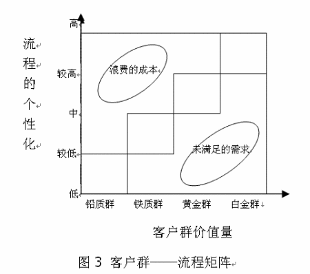 圖中橫軸代表客戶群價值量,從“鉛質客戶群”到“白金客戶群”過渡?v軸表示業(yè)務流程的個性化程度(包括流程的靈活性、流程的活動承擔者的設置、流程中的活動要素的配置等),是一種與客戶群價值量相對應的供應方面的流程特征。左上方的橢圓圈表示對價值量低的鉛質群、鐵質群客戶設置了個性化較高的流程,這表明企業(yè)資源配置不合理,因而有些資源的投入大于產出,從而產生過高的成本。右下方的橢圓圈則代表了未被滿足的需求。用很標準化的、缺乏人情味的流程向高價值的黃金群客戶、白金群客戶提供產品和服務,將難以讓這些客戶滿意,從而導致高價值客戶的流失。圖的中間部分,四個矩形框的對角線位置則代表了客戶群價值和流程個性化恰當?shù)钠ヅ。因此,企業(yè)可在四個矩形框的各自兩條對角線相交部分設置“白金客戶群流程、黃金客戶群流程、鐵質客戶群流程、鉛質客戶群流程”這四類流程,以此找到客戶群——由資源創(chuàng)造的產品和服務——流程群的最佳匹配。從圖中也可看出,鉛質客戶群流程的標準化程度最高,通常不用提供特殊的個性化的服務及產品。白金群客戶流程的定制化則最高,企業(yè)需要為其量身打造流程。顯然這兩個流程的資源分配存在極大的差異。