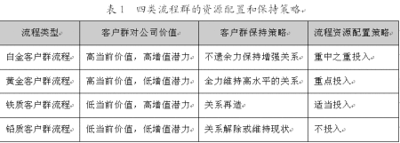 流程由活動、活動的邏輯順序、活動的實現(xiàn)方式、活動的承擔者四個基本要素組成。通過活動的整合來產生“流程多面手”或活動講廢除來減少成本,利用信息技術將“串聯(lián)”活動變成“并聯(lián)”活動來改變活動斬邏輯順序以提高流程效率,或者改變活動承擔者的數(shù)量或素質,這些都將導致流程群資源分配的變動。例如,銀行的業(yè)務流程設置:低價值客戶以電子設備的自助服務為主;中價值客戶以柜面服務為主;高價值客戶以大戶室一對一服務為主;設置專業(yè)化的理財中心,由客戶經理全程代為辦理各項業(yè)務,同時由高素質的理財專家根據(jù)客戶的風險收益偏好提供高質量的理財產品等。可見,不同客戶其流程的資源配置差異較大。依據(jù)客戶群——流程矩陣,下表描述了四類流程群所對應的四類客戶群的四種資源配置方式。