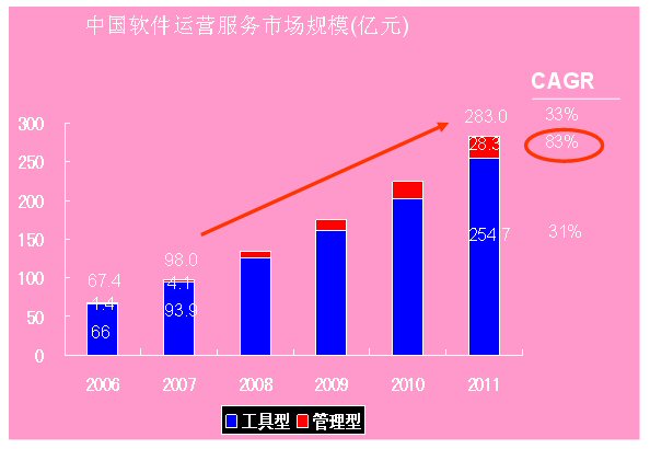 2006中國軟件運營服務(wù)(SaaS)產(chǎn)業(yè)的規(guī)模為68億元,2011年將突破400億,達(dá)到406億元,未來五年的復(fù)合增長率達(dá)到43%。這是國內(nèi)ICT領(lǐng)域權(quán)威研究機(jī)構(gòu)計世資訊(CCW Research)在其最新發(fā)布的《軟件業(yè)的下一個十年——中國軟件運營服務(wù)(SaaS)市場發(fā)展趨勢研究報告》中指出的。