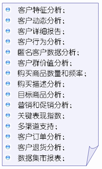 IQ等主流數(shù)據(jù)倉庫系統(tǒng)的無縫銜接,實現(xiàn)了CRM最核心的價值——多維度的客戶分析,從而在技術上和應用上遠遠超越了傳統(tǒng)的CRM。