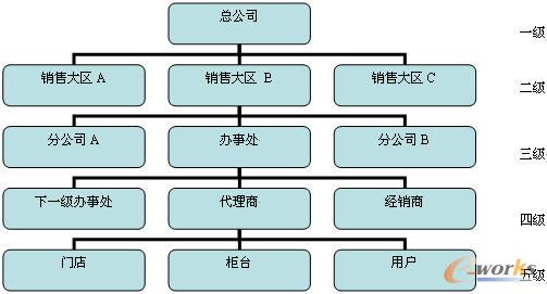 目前國內企業(yè)分銷網(wǎng)絡層次最多可達到五層,如圖1所示。最上層是營銷總部,第二層是銷售大區(qū),第三層是各地分公司、辦事處,第四層是各地辦事處、代理商和經(jīng)銷商,第五層是用戶或門店。