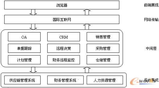 中間層:是實現(xiàn)具體的應用功能的層次,包括銷售、采購、倉儲管理、遠程審批/監(jiān)控/決策等;