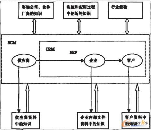 供應(yīng)鏈上的各個(gè)企業(yè)在各自ERP系流運(yùn)行的基礎(chǔ)上,與客戶之間用CRM系統(tǒng)聯(lián)結(jié)起來,而整個(gè)供應(yīng)鏈上的所有企業(yè)都在SCM系統(tǒng)框架之內(nèi)。三者整合過程中,供應(yīng)鏈上各個(gè)企業(yè)(包括上游企業(yè)即供應(yīng)商,下游企業(yè)即客戶)資料中的知識(shí)由各個(gè)企業(yè)傳遞到CRM信息管理平臺(tái)之上。而咨詢公司與軟件廠商的知識(shí)、實(shí)施和應(yīng)用過程中創(chuàng)新的知識(shí)以及行業(yè)經(jīng)驗(yàn)等知識(shí)則需要在整合過程中在各個(gè)企業(yè)湖軟件廠商之間相互交流、磨合,最后提出大家都比較滿意的方案,付諸實(shí)拖。