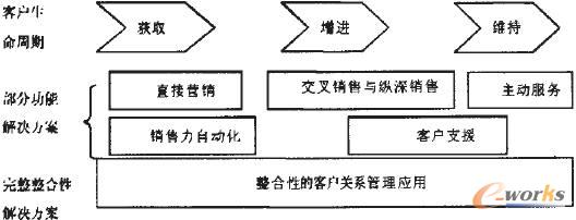 Kalakota and Robinson認為,客戶關系管理主要包括了三個不同的階段,分別為獲取(Acquisition)、增進(Enhancement)與維持(Retention)。而這三個各異的部份,也正和客戶的不同生命周期階段不謀而合。