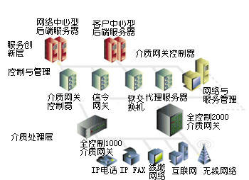 8200 IP傳真服務(wù)器等。中間層通過協(xié)議適配解決通用信令問題,并且提供網(wǎng)絡(luò)和服務(wù)管理。第一層包含Total Control 1000介質(zhì)網(wǎng)關(guān),它通過多種訪問網(wǎng)絡(luò)將不同類型的業(yè)務(wù)量綜合在一起。