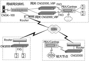 根據(jù)實(shí)際的話務(wù)量和人員數(shù)量,選用FXO接口2-8路語(yǔ)音的CNG2000 IP語(yǔ)音網(wǎng)關(guān)1臺(tái)?梢赃x用PBX應(yīng)用方式或向電信公司申請(qǐng)Centrex業(yè)務(wù)。