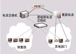 目前,大多數大型企業(yè)與分支機構的電話和計算機網絡是相互獨立的,分處各地的辦公機構建有局域網,局域網之間通過Internet或企業(yè)專網互連,企業(yè)的數據業(yè)務通過計算機網絡傳輸。而各辦公機構的電話網則采用傳統(tǒng)的電話交換機或集團電話,內部員工之間相互是分機撥號,電話交換機接入電信電話公網,與外部的語音交流需要通過本地電話網或長途電話網。